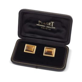 in oro giallo 18kt, di forma rettangolare, con al centro due pietre occhio di tigre taglio cabochon, firmati "Piaget", punzone 750, dim. cm 2x1,5x2,5 circa, gr. 19 complessivi. Corredati di scatola.