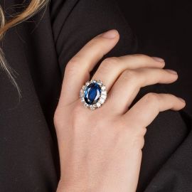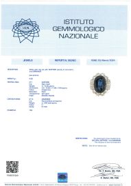 in oro bianco 18kt, impreziosito al centro da uno zaffiro taglio ovale di ct 14.30 circa, circondato da diamanti taglio brillante e tapes per ct 3.60 circa, punzone 750, mis. 14/54, gr. 9. Corredato di certificato IGN del 20/03/2024 attestante le caratteristiche e l'assenza di trattamenti termici.