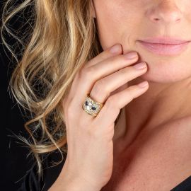 in oro giallo 18kt, impreziosito da due zaffiri taglio a goccia per ct 0.70 circa, due diamanti centrali per ct 1 circa e pavé di diamanti taglio brillante per ct 1.50 circa, mis.12/52, gr. 14
