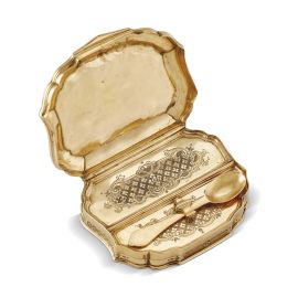 in oro giallo, dai lineamenti ondulati, corpo e coperchio lavorati a incisione, con al centro un motivo campestre cinto da tralci e ghirlande, recante uno scompartimento iterno apribile con piccolo cucchiaio, dim. cm 5x4x2 circa, gr. 44