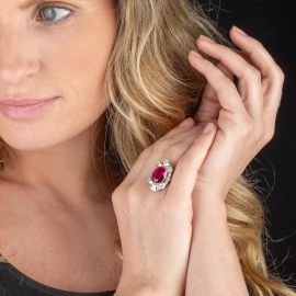 in platino e oro giallo 18kt, impreziosito al centro da una pietra sintetica sfaccettata circondata da diamanti taglio vecchio per ct 1.60 circa, mis. 12/52, gr. 7