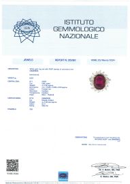 in oro bianco 18kt, impreziosito al centro da un rubino tailandese di ct 4.50 circa, circondato da diamanti taglio navette per ct 2.50 circa, mis. 16/56, gr. 6. Corredato di certificato IGN del 20/03/2024 attestante le caratterstiche.