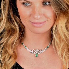 in oro bianco 18kt, impreziosita da smeraldi taglio a goccia e carré per ct 4 circa, diamanti taglio brillante e huit huit per ct 3 circa, lungh. cm 42, gr. 25