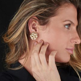 in oro giallo 18kt, composti da cumuli di perle di mm 6 e 4 circa, punzone 750, chiusura a clip, dim. cm 2,5x2,5 circa, gr. 22 complessivi