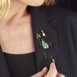 di cui uno in oro bianco e argento, raffigurante un buddha in giada e onice, impreziosito da rose di diamante, dim. cm 1,5x7,5, gr. 5; uno spillo in oro giallo 9kt raffigurante un piccolo fiore con un diamante taglio vecchio, lungh. cm 7,5, gr. 2; una terza spilla in oro giallo 9kt, impreziosita da uno smeraldo taglio fantasia e un diamante taglio vecchio di ct 0.50 circa, lungh. cm 6, gr. 1