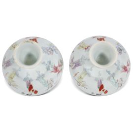 in porcellana policroma della famiglia rosa. Le figure rappresentano otto immortali che poggiano sopra le nuvole e i piedi delle coppe sono decorati con i fiori delle quattro stagioni.