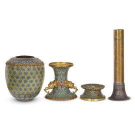 Cloisonné, also known as 'Jingtailan (景泰蓝)', is made by stringing thin copper wires into various design shapes, attaching them to the copper support, and then filling the spaces with different coloured enamels according to the design requirements. Finally, it is fired in the kiln repeatedly until the enamel covers the object with the desired thickness, then it is polished and gilded. According to the treatise 'Ge Gu Yao Lun: treatise on kiln pots' written by Cao Zhao at the end of the Yuan dynasty and the beginning of the Ming dynasty: 'Islamic kilns use copper as the body and use medicinal herbs to burn in five floral colours, similar to Franconian inlay... also called the kilns of foreign countries." It can be seen that Cloisonné enamel was introduced to China from the Arab region in the mid-13th century and reached its peak during the reign of Jing Tai in the Ming dynasty. During the Qing dynasty, the technique reached greater maturity.