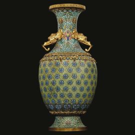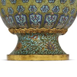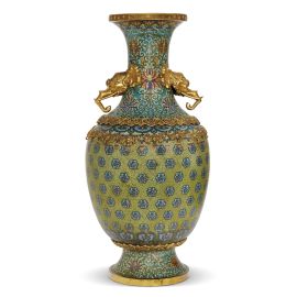 This vase features luxurious and intricate workmanship, making this object a true masterpiece. The vase has a slightly everted rim, a long narrow neck and an ovoid body on a flat foot with elephant ear decoration on the sides of the neck. The vase consists of three parts: an upper rim from the narrow neck that flows into the ovoid body of the vase made separately, which in turn rests on the base with a trumpet foot. The body of the vase thus inserted can rotate. The neck and base are covered with sky-blue Cloisonné enamel with enveloping lotus motifs, mixed with motifs of flowers and fruits, berries and banana leaves; the shoulders are divided into gilded sections with motifs of clouds, a symbol of good omen, and bats; finally, the joint is decorated with a gilded cord motif; the body is covered with yellow-green enamel in the traditional Chinese colour '秋香色' (qiū xiāng sè).
