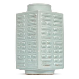 in porcellana celadon a forma Guan type Cong, raffigurante Gua sul rilievo, reca il marchio Daqing Guanxu nian zhi sotto la base.