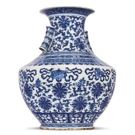 in porcellana bianco blu a forma Hu, con due manici a forma di bambù dipinti con foglie di bambù. La parte superiore è dipinta con fiori di loto e rami avvolgenti, mentre il collo è decorato con motivi Hui, onde e rami Ruyi. La parte principale costituita dalla pancia è dipinta con fiori di loto, rami, e gli otto tesori preziosi: la Ruota del Dharma, la Conchiglia Sacra, l'Ombrello Prezioso, il Parasole Bianco, il Fiore di Loto, l'Anfora Preziosa, il Pesce d'Oro e il Nastro Infinito. La parte inferiore è decorata con petali stilizzati e motivi a volute di foglie.