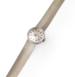 cassa in oro biano 18kt, fondello a pressione marcato "Elaphir", corona marcata, quadrante argenté, indici applicati, movimento a carica manuale, bracciale integrato in oro bianco 18kt a maglia tessita con chiusura a scomparsa marcata Tissot, vetro minerale, gr. 37. Diam. mm 20