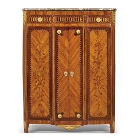 lastronate in legni vari con piano in marmo grigio e applicazioni in bronzo dorato; due ante sul fronte, fascia superiore con intarsi a motivo geometrico centrata da due maniglie rotonde centrate da fiori, angoli scantonati con alle estremità applicazioni a motivo geometrico arricchite da fiori in bronzo dorato, fronte leggermente mosso tripartito da nastri con intarsi a motivo geometrico con interno impiallacciatura in legno chiaro che interessa anche i fianchi, all'interno delle cornici laterali decoro a rami fioriti, mentre la parte centrale presenta alle estremità quattro medaglioni in bronzo dorato a motivo floreale, pendaglina in bronzo dorato con decorazione di foglie, cm 160x124x46