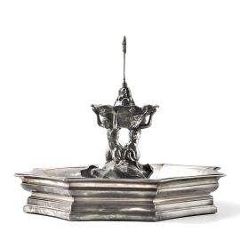 in argento raffigurante la Fontana dei Tritoni al Foro Boario a Roma, opera progettata dall'architetto Carlo Francesco Bizzaccheri nel 1717. Il progetto, che trae ispirazione dall'omonima fontana di Gian Lorenzo Bernini in piazza Barberini, fu ideata per omaggiare il committente, Papa Clemente XI, motivo per cui la vasca ebbe forma di un ottagono con i lati concavi, in modo da ricordare la stella a otto punte che caratterizzava lo stemma della famiglia Albani da cui proveniva il pontefice. Nella vasca, sopra un grande scoglio centrale si trovano due tritoni inginocchiati, scolpiti da Francesco Moratti, nell'atto di sorreggere un’ampia conchiglia a forma di ostrica con funzione di catino, sul cui bordo esterno campeggiano altri due stemmi araldici della famiglia Albani e al cui centro zampilla l’acqua; cm 55x66x66, grammi 15.730 lordi