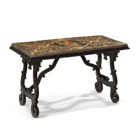 di forma rettangolare decorato in policromia su fondo nero, motivo a volute policrome con riserve di girali e fiori, centrato da cartiglio ovoidale centrato da figura di pappagallo su un tralcio tra due uccellini e frutta, cm 144x68x4; montato su tavolo in legno ebanizzato con gambe a lira riunite da traverse sagomate, cm 88x151x73,3 (complessivamente)