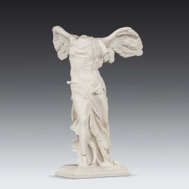 in gesso raffigurante la Nike di Samotracia dal modello classico, cm 95x70x82; su colonna in legno dipinto, cm 100x36x36