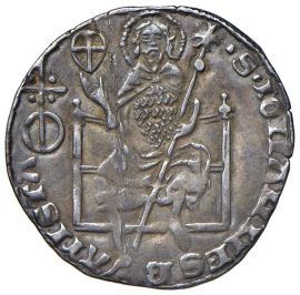 Ar gr.2,49 Giglio R/ Santo benedicente seduto su uno scranno MIR 58/10 (nel simbolo qui rappresentato il cerchio è attraversato dall’asta crociata)