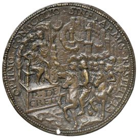 Ae gr.18,79 Ø mm.40 LVDOVICVS MA SF VICO DVX BARI DVC GVBER Busto corazzato a d. R/ OPTIMO CONSCILIO SINE ARMIS RESTITVITA Sfilata di cavalieri, con in testa il Moro, davanti a un trono su cui è seduto il cardinale Paolo di Campofregoso, doge di Genova. Sul basamento del trono, inciso, P DE CRETO. Sullo sfondo il porto fortificato di Genova. Armand I, 109, 8; Hill 654; Pollard I, 138; Vannel-Toderi 401