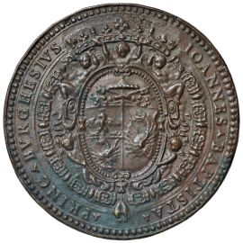 Ae gr.60 Ø mm.58 IOANNES BAPTISTA PRINC BVRGHESIVS Stemma coronato entro Collare del Toson d’oro R/ SP GREG VIGILA TVTELAE NOSTRAE Prospetto anteriore della nuova chiesa; es. data. Mod. 230