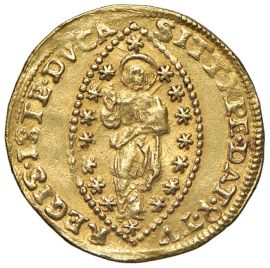 Au gr.3,48 S. Marco nimbato, stante a s., porge il vessillo al Doge genuflesso R/ Il Redentore entro un’aureola ellittica stellata. Mont. 2560 Fr. 1391 Gig. 67