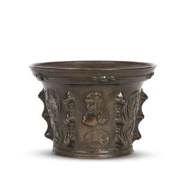 in bronzo patinato, corpo troncoconico con orlo modanato leggermente estroflesso e base piana, parete scandita da sei flange verticali di andamento mosso con piccoli bottoni intervallate da decori a rilievo posti su doppia fila, costituiti da riproduzioni di figure, medaglie, cammei e placchette, secondo uno schema tipico utilizzato dalla dinastia di fonditori du Boys (talvolta anche Dupois), attivi nella cittadina francese di Puy en Velay tra la fine del Cinquecento e tutto il secolo successivo; alt. cm 10,2, diam. cm 14,7
