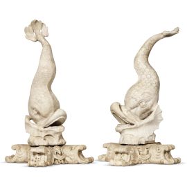 coppia di sculture in marmo raffiguranti due delfini con la bocca spalancata e la coda ritta, poggianti su basse basi non pertinenti sagomate e riccamente scolpite a volute; cm 87x54x54 (delfini cm 87x27x56 circa, basi cm 15x54x54)