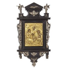 in legno ebanizzato di forma architettonica con applicazioni in argento, sormontate da quattro figurine di angelo scolpite a tutto tondo in argento. All'interno contengono due placchette in bronzo dorato di area germanica del secolo XVII raffiguranti due rappresentazioni della Sacra Famiglia, di cui una insieme con San Giovannino e la madre Elisabetta. Cornici cm 37,5x19,5; placchette cm 13,7x10,6