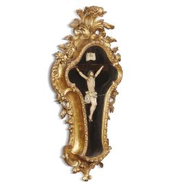 scultura in cera policroma su croce in legno ebanizzato con cartiglio in cera, entro ricca cornice a teca sagomata in legno intagliato e dorato con vetro sul fronte; Cristo cm 29x20, cornice cm 90x48x8