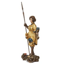 scultura in legno di tiglio intagliato, dorato e dipinto in policormia, raffigurante il santo in posizione stante, vestito dell'armatura, i piedi a schiacciare un drago sul quale poggia anche una lunga picca impugnata con la mano destra; cm 130x62x34