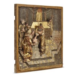 Spanish carver, 16th century, Presentation of Jesus in the Temple, polychrome painted and gilth wood high relief