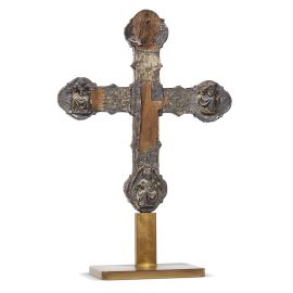 in lamina d’argento con tacce di doratura lavorata a sbalzo e cesello e applicata su struttura lignea dal profilo mistilineo a terminazione polilobata. Sul fronte al centro Cristo crocifisso, ai lati la Vergine e San Giovanni evangelista, in alto l’Eterno benedicente e in basso Maria Maddalena; sul retro, privo di parte della decorazione, tre figure di Evangelisti; cm 49,5x43