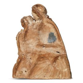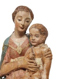 rilievo in terracotta dipinta in policromia con dorature. Derivato dalla cosiddetta Madonna di Prato, importante rilievo in marmo del periodo giovanile di Matteo Civitali (Lucca 1436-1502) oggi conservato nella chiesa pratese di San Vincenzo Ferrer e Santa Caterina de' Ricci, questo rilievo appartiene alla dozzina di esemplari in terracotta e stucco analiticamente descritti in occasione della mostra dedicata all'opera dello scultore lucchese nel 2004. Le dimensioni nonché l'assenza del fondo e delle aureole apparentano il nostro esemplare al almeno altri quattro, anch'essi in terracotta, tutti prodotti a partire da uno o più calchi proporzionalmente rimpiccioliti nella misura di un quinto rispetto all'archetipo marmoreo di Prato; cm 65x49,5x10,5