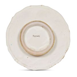 in maiolica dipinta in monocromia verde, corpo circolare con orlo appena rilevato e centinato dall’andamento mistilineo, poggiante su alto piede: Il decoro mostra un paesaggio con un grande albero spezzato con fronde a ciuffi arrotondati e rami spogli, alcuni uccelli in volo e ai piedi dell’albero un corvo e un cespuglio dalle foglie allungate. Questo tipo di decorazione, come confermato anche dalla presenza della firma al retro, fu utilizzato a Savona dalla manifattura Boselli in varianti con uccelli acquatici e differenti tipologie arboree. A tal proposito si veda in confronto il bacile della Fondazione De Mari. Al verso firma Jacques Boselly; diam. cm 28,6, diam. piede cm 15, alt. cm 5