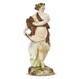 in porcellana dipinta in policromia, raffigurante personaggio femminile in abiti romani con il capo coperto da una corona di foglie, mentre incede sollevando un capo dell’abito e parte di una pelliccia che ne ricopre il corpo: probabilmente una allegoria. Le modalità esecutive e la policromia e fanno ritenere l’opera prodotta dalla manifattura reale di Capodimonte, come confermato dalla marca, probabilmente già nella sua fase spagnola. Marca giglio in blu sul fondo; alt. cm 19