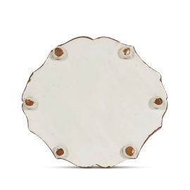 in maiolica dipinta in policromia, forma mistilinea con orlo appena rilevato e centinato bordato di marrone, poggiante su sei piedini rilevati. La superficie mostra un decoro floreale stilizzato con un gruppo principale con andamento verticale a partire da una corolla principale e due rami, e altri due gruppi a completare l’ornato. Questa decorazione trova riscontro in tre piatti del museo di Arti Applicate del Castello Sforzesco di Milano ed è prossimo alle decorazioni cosiddette “a foglia di tabacco”, qui declinata in una versione cromatica meno comune, in coi predominano i colori freddi; cm 20,4x22,8, alt. cm 2,2