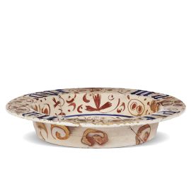 in maiolica decorata a lustro metallico, oro e blu, ispirato ai bacili cinquecenteschi della “serie dell’Ave Maria”. Il bacile ha larga tesa piana e un profondo cavetto con parete verticale, centrato dalla raffigurazione di un volatile delineato in blu tra sottili tralci vegetali; sulla tesa invece è presente l’iscrizione abbreviata in quattro parti: ave – ma – ple -na intervallata da decori circolari. Anche il retro è interamente smaltato e decorato da motivi spiraliformi in oro; diam. cm 37,4, alt. cm 6,8