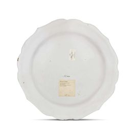 in maiolica dipinta in policromia con orlo sagomato e mistilineo, decorato con un motivo noto come “a paesini e architettura”: su alcune isole aeree una scena di corteggiamento tra un giovane e una dama a cavallo, un’architettura in rovina e alcuni animali accompagnati da un volo di uccelli e insetti. Alcuni piatti di questa tipologia sono conservati nelle civiche raccolte del Castello Sforzesco di Milano, mentre uno di dimensioni appena inferiori era stato pubblicato nel catalogo della mostra sulla maiolica lombarda del 1964 al Poldi Pezzoli ed è oggi conservato alla Pinacoteca di Varallo. Al verso scritta Milano in manganese, etichetta di provenienza Silvia Giusti – Milano ed etichetta della mostra “Figure e Chinesi”. Maioliche milanesi di Felice Clerici con il n. 55; diam. cm 32,5, alt. cm 3,2