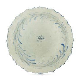 in maiolica dipinta in monocromia blu, di forma circolare con piccolo cavetto cordonato e separato dall’ampia tesa decorata a rilievo con alternanza di conchiglie, mascheroni e sirene alate a circondare alcune riserve ovali. La decorazione pittorica vede al centro una scena mitologica a scenografia barocca e nelle riserve piccole scenette paesaggistiche con uccelli. Un confronto per forma e decoro può essere fatto con un piatto reale della manifattura Salamone, conservato nella Raccolta di Arti Applicate del Castello Sforzesco a Milano, dove sono conservati anche due esemplari con forma analoga e decoro a policromia. Al verso marca Corona e lettere M.C.; diam. cm 47,2, alt. cm 4,5