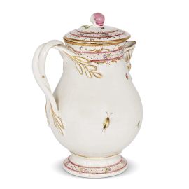 in maiolica policroma, corpo piriforme a parete liscia su basso piede svasato, beccuccio a mensole sovrapposte e anse a forma di rametti intrecciati, coperchio piano con presa a piccolo frutto. Il decoro, racchiuso da fasce orlate di rosa riempite da punti e fioretti, mostra piccoli insetti che si stagliano sullo smalto bianchissimo, secondo un ornato che si ispira alle grandi produzioni di porcellana francese e tedesca allora di voga. Un interessante confronto assai prossimo ci deriva da un servizio da caffè conservato nelle Raccolte di Arti Applicate del Catello Sforzesco; alt. cm 17,8, diam, bocca cm 7, diam. piede cm 7,2