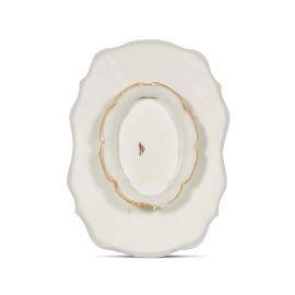 in maiolica decorata a piccolo fuoco, di forma rettangolare dal profilo mistilineo con orlo sagomato e listato di bruno marrone, su alto piede ovale. Il decoro vede protagonista un tulipano appena aperto di colore porpora accompagnato da fioretti minori. Al verso, sotto il piede, un segno “chiodo” in bruno di manganese; cm 18x24,5, alt. cm 5