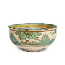 in maiolica dipinta in policromia nei toni del verde rame e giallo antimonio applicati sopra la barbottina e subito coperti con vernice, secondo la tecnica della città spagnola. Il corpo, di forma emisferica, presenta una decorazione tipica, spesso imitata, con un volatile al centro tra piante e alberelli, che si ripetono anche all’esterno; diam. cm 30,2, diam. piede cm 12, alt. cm 15