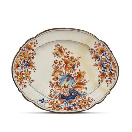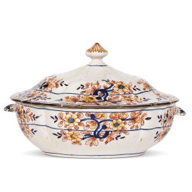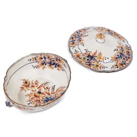 in maiolica dipinta in policromia. Il vassoio è ovale con orlo mistilineo e polilobato, privo di anello di appoggio, e mostra un decoro policromo che si diparte da un elemento principale di andamento quasi triangolare nel quale prevale un fiore principale di colore blu circondato e accompagnato da boccioli e racemi definiti in gergo “alla foglia di tabacco”, con prevalenza dei colori blu e arancio. La zuppiera ha corpo ovale polilobato dotato di due piccoli manici e di un coperchio polilobato e sormontato da un pomolo a bottone cuspidato, e reca una decorazione coerente con il presentatoio, che si sviluppa lungo il corpo e sul coperchio, disposta lungo un sottile filetto blu; zuppiera cm 18,5x30x23, vassoio cm 28x35,2