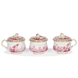 in porcellana dipinta in policromia e oro, la superficie interamente decoro a monocromia porpora con paesaggi alberati. Coperchi sormontati da presa a forma di frutto policromo e bordati con il tipico decoro definito “a mezzo uovo”; alt. cm 7,5 (compreso il coperchio)