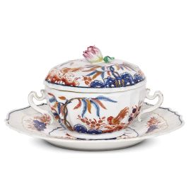 in porcellana dipinta in policromia con decoro a galli rossi, blu e oro, secondo il caratteristico motivo della manifattura con galletto su zolla rocciosa con alberi dalle lunghe foglie. Tale decoro, sviluppato a Doccia con diverse varianti, è di chiara derivazione asiatica, ispirandosi ai manufatti Kang-shi della prima metà del XVII secolo. La tazza ha forma emisferica con corpo percorso da ampie baccellature, completa di due prese sagomate; coperchio sormontato da grande presa sagomata a forma di fiore; piatto dall’orlo mosso con lavorazione a canestro; tazza diam. cm 14, piatto diam. 24,2