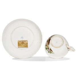 in porcellana dipinta in policromia e oro, secondo la tipica decorazione “a natura morta”, che occupa una sola faccia della tazza e il centro del piattino, realizzata con una tecnica pittorica accostabile al puntinato tipico della direzione Caselli. Tale tipologia di decorazione, che non viene mai ricordata nei giornali di fabbrica, viene concordemente attribuita a Giacomo Nani e al figlio Mariano, assunti in manifattura come “pittori di animali e delle cose natutrali”. Tazza a coppetta su piede ad anello con ansa sagomata. Marca giglio in blu e lettere incusse nella pasta sul fondo di entrambi i pezzi ed etichetta di provenienza M.C. SESTIERI – ROMA sul retro del piattino; tazzina alt. cm 4,8, piattino diam. 13,6