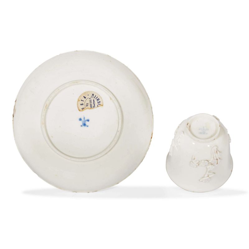 in porcellana bianca decorata con i cosiddetti “fiori di pruno” a rilievo, secondo una tipologia che venne utilizzata da tutte le manifatture europee nei primi anni della loro attività. Il decoro deriva dalle porcellane cinesi della provincia di Fu-kien, conosciute in Europa come Blanc de Chine e importate tra la fine del XVII e gli inizi del XVIII secolo. Tazza a campana con orlo svasato e piede ad anello, priva di manico. Marca giglio in blu sul fondo di entrambi i pezzi e tracce di etichetta di provenienza QUESTA ANTICHITÀ – Torino sul fondo del piattino; tazzina alt. cm 6,6, piattino diam. 14,2