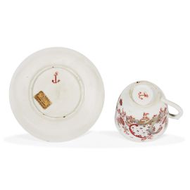 in porcellana dipinta in policromia e oro, decorata in stile Imari con piccole case, motivi floreali, rocailles, farfalle e uccelli in volo. Tazza a campana su base ad anello con presa sagomata sormontata da bottone. Marca in rosso su entrambe i pezzi, sul retro del piattino etichetta di provenienza LUKACS-DONATH ROMA; tazzina alt. cm 6,7, piattino diam. cm 12,4