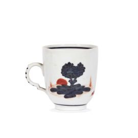 in porcellana dipinta in policromia e oro nei toni Imari, decorata su un lato da paesaggio con due alberi su ampie zolle erbose impreziosite da ampi tocchi d’oro, sull’altro da una veduta più semplice con un singolo albero e il sole all’orizzonte. Tazza a forma di campana su piede ad anello con presa ad orecchio; alt. cm 6,8
