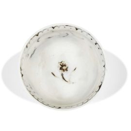 in porcellana dipinta in bruno di manganese con abbondanti lumeggiature in oro. La decorazione prevede piccoli edifici orientali disposti su terrazze legate tra loro da arbusti fioriti, tipico esempio di quei motivi “alla cinese” tanto amati in Occidente e spesso presenti nella produzione della manifattura veneziana. All’interno della tazzina un fiore su stelo fogliato. Tazza a coppetta su base ad anello. Sul fondo marca in bruno VENEZIA e numero 3 inciso nella pasta; alt. cm 5,4, diam. cm 7,7