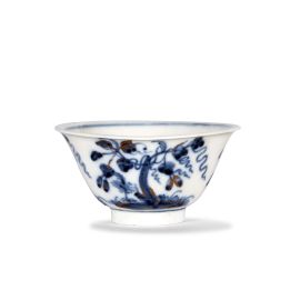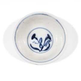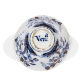 in porcellana dipinta in azzurro sottovernice con lumeggiature in oro. La decorazione prevede lungo la parete esterna tre alberelli con foglie e lunghi viticci, mentre il centro della tazzina mostra due campanule racchiuse in un cerchio. Decoro questo utilizzato spesso nella fabbrica Vezzi, a partire dal primo periodo della manifattura. Tazza di forma ispirata ai prototipi cinesi, su base ad anello. Marca in blu sul fondo Ven:a; alt. cm 3,6, diam. cm 7,2