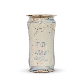 in maiolica policroma, corpo cilindrico poco rastremato al centro e dotato di spalla arrotondata poco pronunciata da cui si diparte un breve collo cilindrico con orlo estroflesso, piede basso su base piana. Il decoro, realizzato in monocromia blu su fondo a smalto stannifero bianco povero, vede al fronte un putto con un uccellino in una mano. Il vaso, datato sul retro 1726, s’inserisce a pieno nel gusto imperante nelle farmacie napoletane intorno al primo trentennio del Settecento. Nel nostro caso il pittore si distingue grazie alle sottili velature di colore presenti nel disegno, a dare corpo alla figura. La tradizione decorativa ammetteva la presenza di figure talvolta anche di grandi dimensioni, con un gusto istoriato, come ad esempio le figure rappresentate su alcuni albarelli della collezione Mazzacane al Museo della ceramica di Cerreto Sannita; alt. cm 21,8, diam. bocca cm 11,5, diam. piede cm 9,6